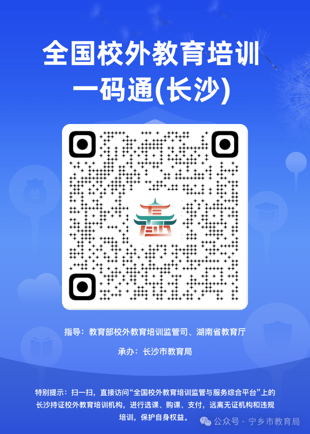 孩子的健康成长是我们共同的心愿。宁乡市教育局在此提醒广大家长,要树立科学的教育观念和成才观念,理性看待校外培训的作用,更多关注孩子的全面发展和综合素质提升。让我们家校社协同发力,共同为宁乡市中小学生打造一个健康、和谐、有序的教育生态,让孩子们度过一个平安、愉快、有意义的童年时光!